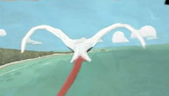 I argue that the short film’s visual panache and heart will keep you engaged however. The animation begins chaotically—the first minute utilizes heavy-ink B&W, collage like cut outs, abstract water colors and props for animation. The familiarity of these traditional approaches is upended slightly by a 3-D framework which allows Dubois to playfully and interestingly manipulate the camera along the z-axis and in 360 degrees, exposing what, on first blush is a 2-D image, to be a careful construction of composited layers, whose perspectives can be changed depending on the virtual camera movement. Most of this work is very subtle until the closing of the film, a bravura head-long rush along the z-axis over varying mountains, fields and beaches while local music swells, which gives the closing a suitably epic and adventurous rush.