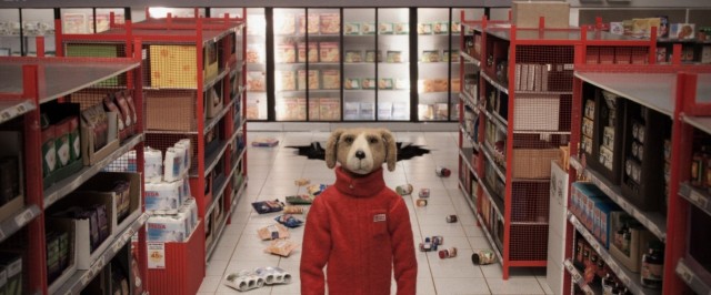 A dog stacking shelves in a supermarket sings about his bad dream