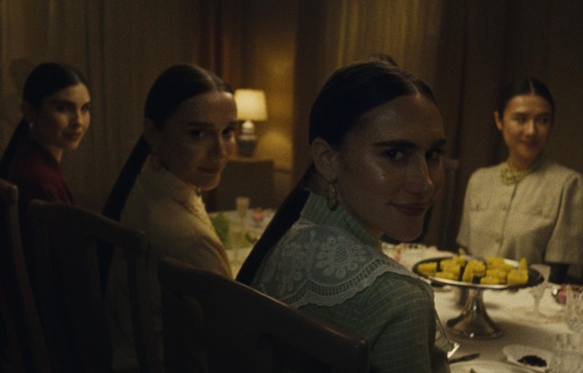 That tension deepens when we leave the dining room for the first time. The cries of a distressed baby and the appearance of a strange cabbage-dispenser expose the darker machinery behind this carefully curated scene. Things only grow more surreal: cabbages are split open to reveal perfect babies, mothers pose proudly for the camera, then pass the newborns off to the waiting staff, who whisk them away behind the scenes.