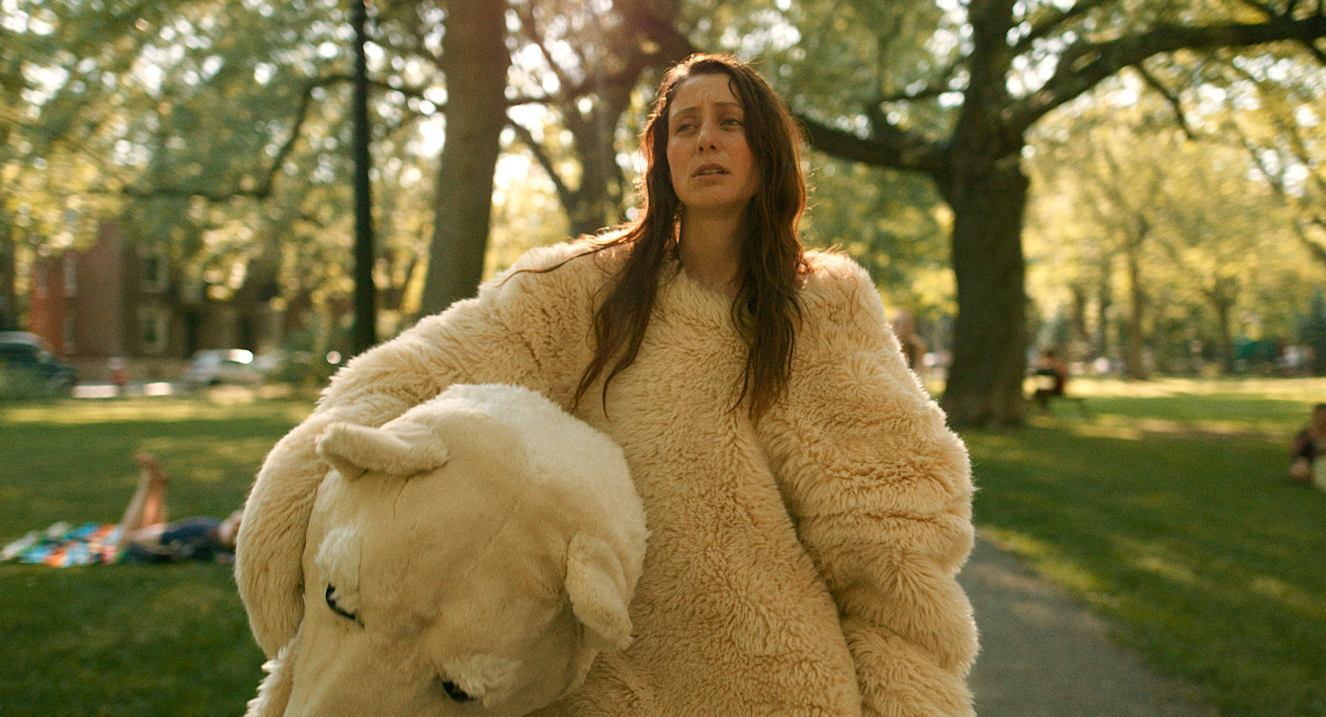 Fauve, in a giant bear costume on a sweaty day, perfectly depicts the isolation of her mental state and the absurdity of her circumstance.
