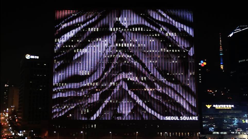 From the documentation video for “scrape” an LED facade on the side of a building in Seoul.