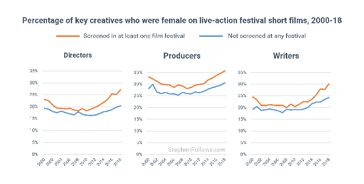 It’s worth pointing out the shortcomings of Stephen’s methodology for this study. He only considered live-action short films that were selected by film festivals which may be leaving many legitimate short films out of the study. He also relies on an algorithm that determines gender based solely on name and doesn’t accommodate for non-binary gender categorization. Stephen calls out these shortcomings explaining why they were necessary and holds that the remaining quantity of films is enough for a meaningful result.